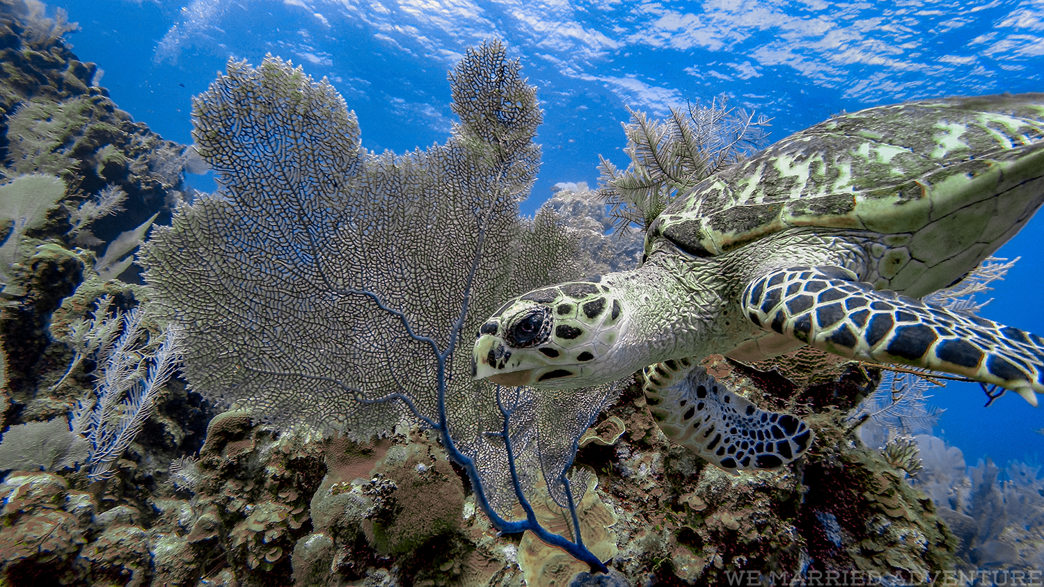 The sea life we found was your typical Caribbean fare, with big yellowtail snapper pacing us throughout the dive and the occasional loggerhead turtle or eagle ray coming in from the deep blue to have a look at us. Although we didn’t see any sharks or other grand pelagic wildlife, all of the dives proved to be colorful and relaxing, providing several close encounters with green turtles and shy, spotted moray eels.